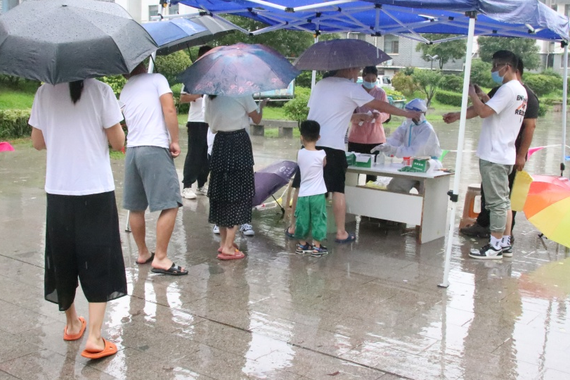 風雨中撐起的一把把花雨傘形成了一道亮麗的風景線。雨雖然下得很大,但沒有影響居民們核酸采樣的自覺性?!罢埓蠹冶3峙抨犚幻拙€、采樣三米線距離,請?zhí)崆皽蕚浜怂釞z測碼!”在核酸采樣現(xiàn)場,居民在社區(qū)志愿者的引導下積極配合,醫(yī)務人員快速精準地進行采樣,現(xiàn)場秩序井然。對于行動不便的群眾,醫(yī)務人員冒雨上門入戶采樣,確?!皯獧z盡檢,應檢必檢”。“雨中核酸”的一幕幕讓我們看到所有人同心、同向、同行、同力,已經(jīng)成為這座城市全力以赴的最強底氣!